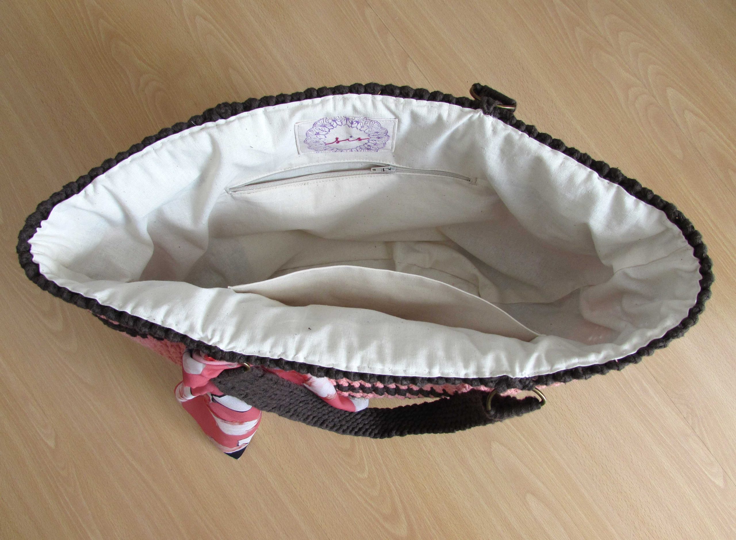Ročno izdelan cekar je unikaten izdelek, ki ga lahko uporabite za na plažo ali se odpravimo z njim na večerni sprehod in po opravkih. V notranjosti ima dva dodatna žepa.